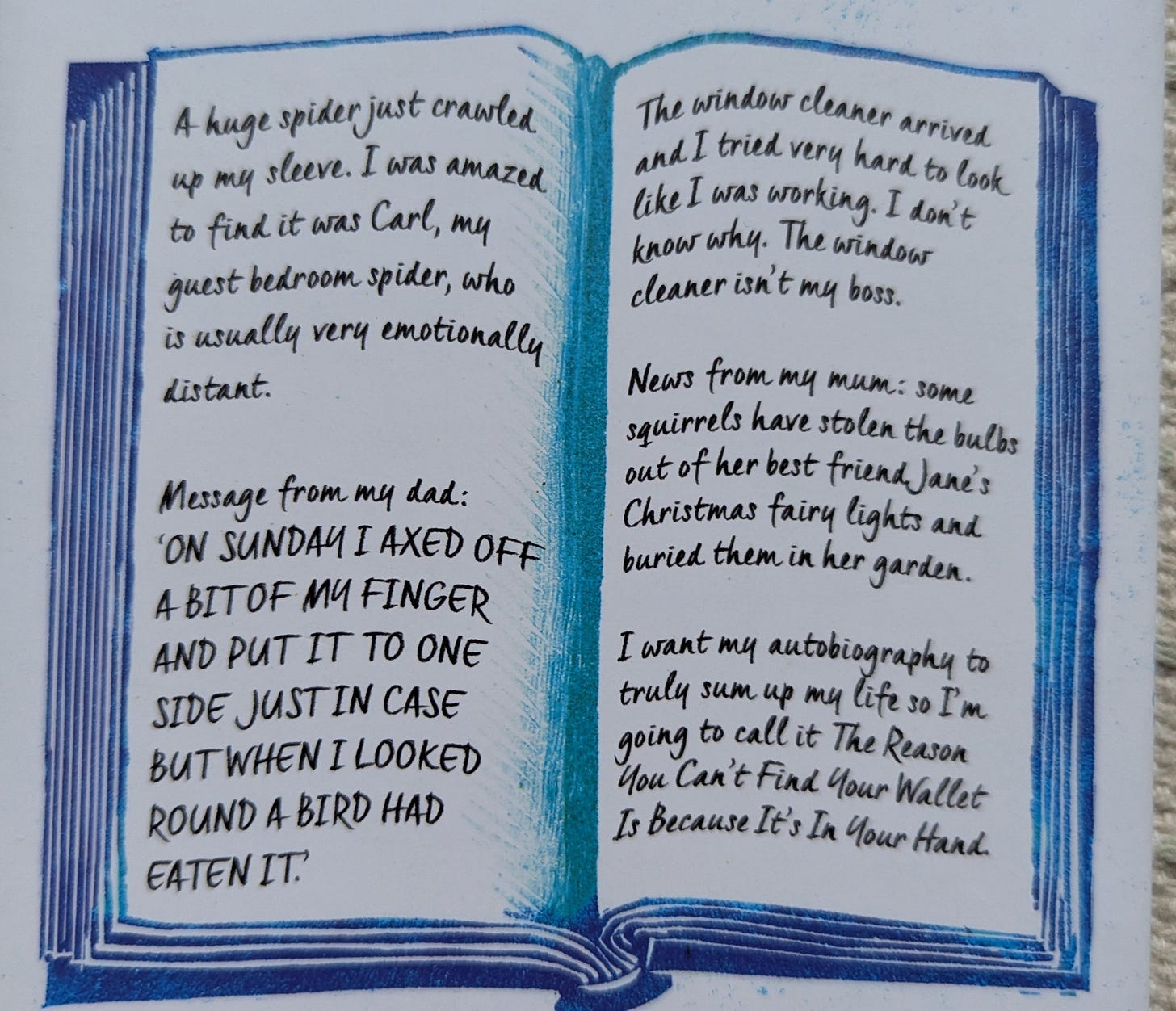 Ditto, tweeness. I’m not sure what tweeness is. I’d say there is a lot of it on Substack. But there’s tweeness that is, in the context of the Big Global Forces that want to shape our consciousness, kind of escapist twee. And then there’s tweeness that is serious business. A resistance to the Big Global Forces that want to shape our consciousness. An assertion that what we want as normal human life (let’s imagine there is no war, economic stress, inequality, injustice etc someone wrote a song about that, didn’t they?) is to think about the differences between Devon and Norfolk, observing spiders, our irrational responses to window cleaners, axing off fingers by accident and not being that bothered, and not being able to find things. (See blurb picture above.) It’d be better for us all if these things could crowd our consciousness rather than wars. At least we should nuture this part of our consciousness to keep it intact for that future time of peace and properity that is around the corner. And if peace and prosperity isn’t round the corner and it’s all going to be global heating and stress, then it will be good to live a life that puts into practice in the here and now the observational skills, gentle irony and loving quirkiness that we need just to be human.